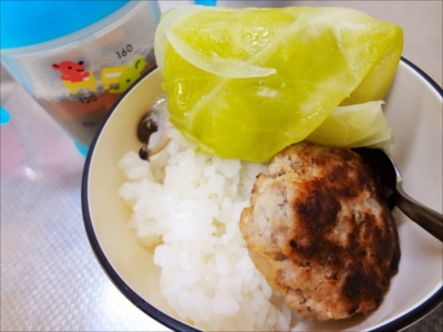 丼スタイルです(;^ω^)ハンバーグは奥歯が無くても食べやすい。節約目的でおからor豆腐を混ぜています。お豆腐はふんわり仕上がりますが、水切りと崩れやすさが面倒で、今回はおからで作りました。第1子のリクエストでロールキャベツも。