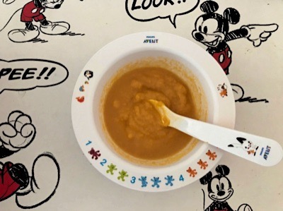 今日はこのほかにも、私と夫がご飯を食べているときに夫の膝の上に座って、ソースのかかっていないパスタを食べてみました。あまり気に入らなかったようで、嫌な顔して口から出してしまいました。長男がペピートの月齢の時には柔らかく煮たパスタを食べさせていたのですが、ペピートはまだその準備はできていないようです。