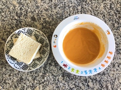 ピュレと一緒に耳を切り落とした食パンも一緒にあげました。食パンはそのままだと食べないので、とても小さくちぎって、ピュレに混ぜて食べさせます。
