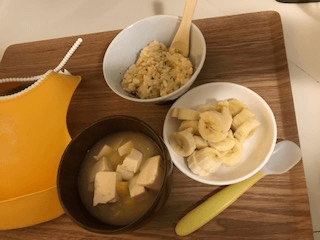 ほぼ完食。じゃがいもは柔らかく煮たのですが、やっぱり噛みきれないのかベーっと出してしまいました。手掴みで食べさせてもうまく食べれず。