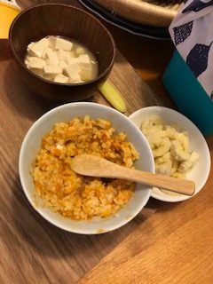 ご飯+チキンキャサロール(カナダの市販ベビーフード。鶏肉の煮込み)