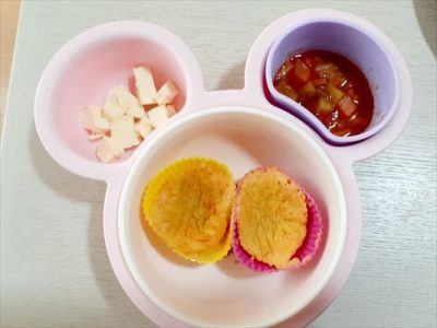 ①ホットケーキミックス(100gくらい)に粉ミルク3杯と水100ml、すりおろしたニンジン(大さじ2くらい)、卵1つを入れて混ぜる