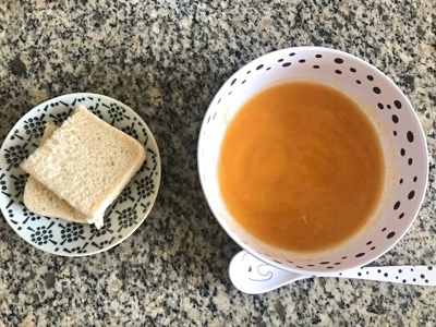 昨日の残りを冷蔵しておいたので、それを少し温めてからあげました。今日は食パンも一緒です。ピュレは完食しましたが、パンは半分くらい食べてあとは嫌がって食べませんでした。食べ始めはお腹が空いているため、固形物でも比較的なんでも食べますが、だんだんお腹が満たされてくる中盤からは固形物は嫌がることが多いです。