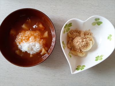 ※きなこを粉のまま食べさせると気管に入ってむせてしまうこともあるので、しっとりするように混ぜてください。