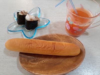 なので、今日のみなんこメシ(昼)は、おにぎりの他に大好きなスナックパンと野菜ジュースにしてみました。