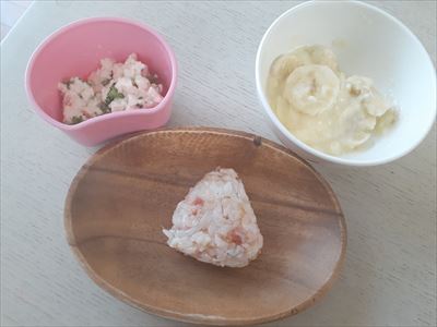 ①柔らかく炊いたご飯に梅干(柔らかいもの)を細かく刻んだものとしらす、鰹節を混ぜ合わせる