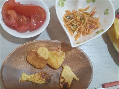 昨日作った冷パスタが冷蔵庫にあったので、ナポリタンスパゲッティも付け合わせて…ってしていると、なんだか喫茶店ぽいかんじに(笑)?