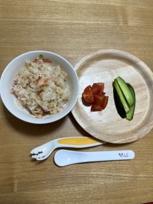 スプーンの練習中なので、こぼれた量も多いですが、カニカマの炊き込みご飯は食べてくれました。炊き込みご飯にすると、タンパク質や食物繊維も一緒に摂取できるので助かります。