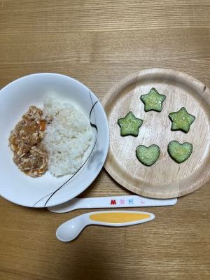 きゅうりは1口食べるもその後は見て見ぬふり?食べませんでした。先日きゅうりスティックは食べてくれたのにな。輪切りは好みじゃなかったみたいです。次はスティックにしてみようと思います。形状を変えるだけで食べてくれるかもしれませんね。離乳食作りは試行錯誤です。