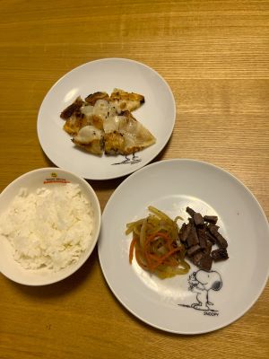〇焼き肉は赤身の牛肉を塩コショウせず焼いています。大人は後から塩コショウと焼き肉のタレで味付けです。