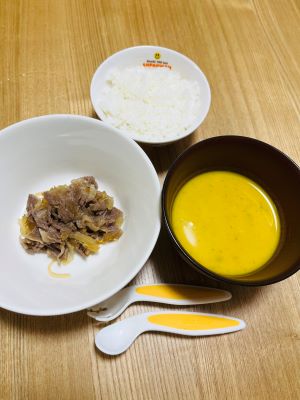 お肉は牛丼よりはあっさりの味付けでご飯に合うおかずでしたが、お肉の気分ではなかったみたいで少し食べて終了しました。