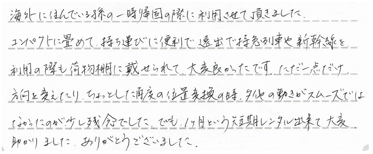 海外に住んでいる孫の一時帰国の際に利用させて頂きました。 コンパクトに畳めて、持ち運びに便利で遠出で特急列車や新幹線を利用の際も荷物棚に載せられて、大変良かったです。ただ一点だけ 方向を変えたり、ちょっとした再度の位置変換の時、タイヤの動きがスムーズではなかったのが少し残念でした。でも、1ヶ月という短期レンタル出来て大変助かりました。ありがとうございました。