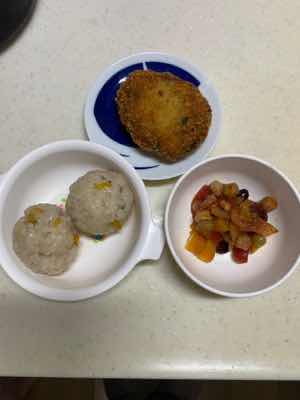 油で揚げたコロッケは初めてだったのですが、サクサク食感が気に入ったようで手でダイナミックにつかみ、食べてくれました。笑