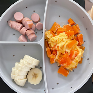 スクランブルエッグは、最近は卵1個分で作っていますが、あっという間に完食してしまいます。せっかち?な息子は、手づかみ食べだとまだ口に残っているのにどんどん口に入れてしまい、よく噛んでいるのか心配になるくらい食べるのが早いです。