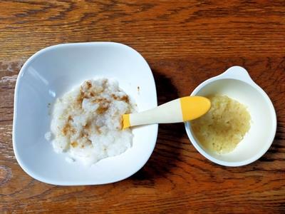 昨日(きな粉がゆと、きゃべつの煮びたし風)の離乳食とあまり変わらないというか、使っている食材はほぼ同じですね…。