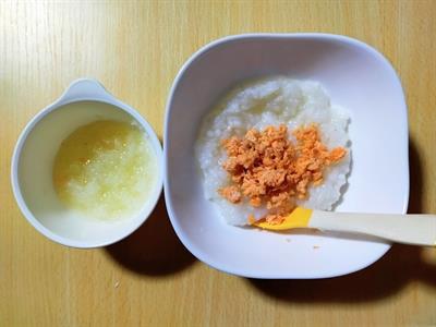 今回は、生鮭をたくさんご飯に乗せて、鮭がゆにしてみました。最初は鮭だけをとって食べさせてみたのですが飲み込みにくそうだったので、混ぜました。
