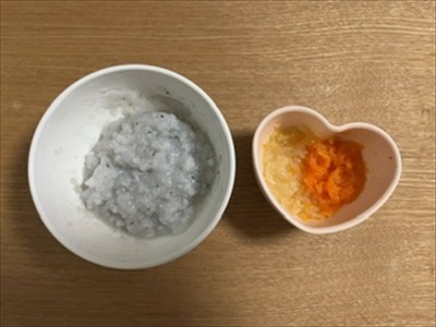 まだ歯が生えていないのですが、食べるときにはモグモグと顎を動かして食べているので、完全にペースト状にはせずに食材の大きさを少しずつ変えています。