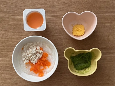 今日のメニューでは、7倍粥に鶏ささみとにんじんを混ぜたものを食べてもらいました!