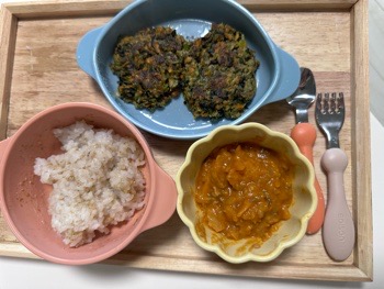 かぼちゃとひき肉のトマト煮込みも気に入ったようで、なんとかスプーンで食べてくれました。