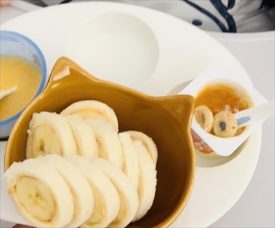 ※輪切りバナナを手づかみさせると誤嚥の危険もあるので、4等分に崩すことで食べやすくしています。