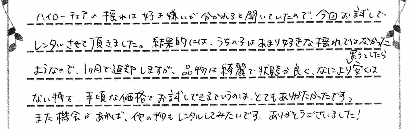 このたびは当店にて、ハイローチェアのレンタルをご利用いただき誠にありがとうございます。今回お試しでお使い頂いたとのことですが、特に大型のベビー用品はご自宅では場所を取って扱いにくかったり、お子様の好みに合わず短期間しか使えなかったりなどのケースもございます。ご購入前に一度レンタルをご利用いただき、お子様の反応を見ていただくのもオススメのご利用方法でございます。
