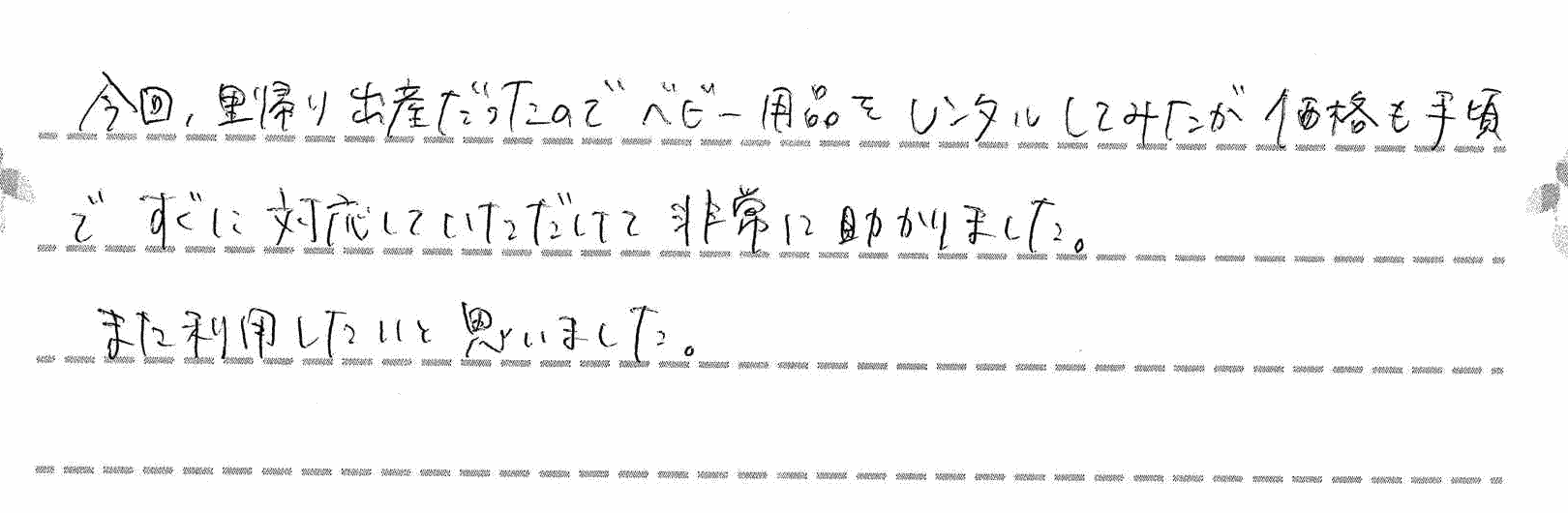 今回、里帰り出産だったのでベビー用品をレンタルしてみたが価格も手頃ですぐに対応していただけて非常に助かりました。また利用したいと思いました。