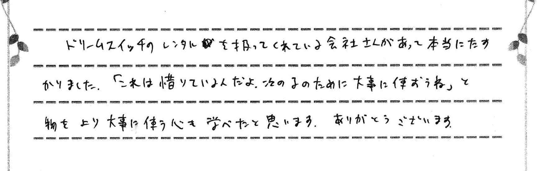 このたびは当店にて、ドリームスイッチのレンタルをご利用いただき誠にありがとうございます。当店のレンタルがお客様のお役に立ててスタッフ一同嬉しく思っております。これからもお客様がスムーズにご利用いただけるよう努めて参りますので、また、よろしければ当店のレンタルをご利用くださいませ。