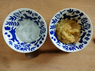 白菜と大根は、色が同じなので分かりづらいですね。出汁で茹でて刻んだものを食べさせています。どちらも今が旬の野菜なので、美味しいはず!しっかりとモグモグと口を動かせながら食べてくれました。
