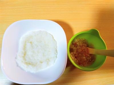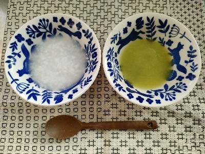 早速みーに食べてもらいました。今日のメニューで気になるのは、やはり5倍がゆです。少しずつ水分を減らしてきたので、大丈夫だと思うのですが、やはり不安になりますね。