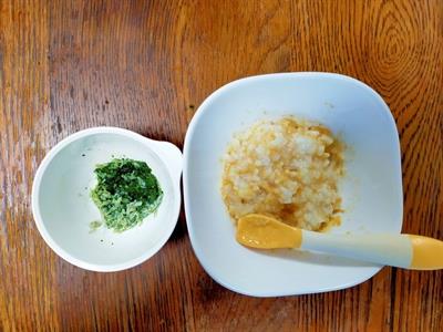 早速みーに食べてもらいました。食べさせてみると、どのメニューもすんなりと食べてくれました。きな粉がゆをしっかり食べてくれるのはいつもの事なのですが、今日は野菜もしっかり食べてくれました。