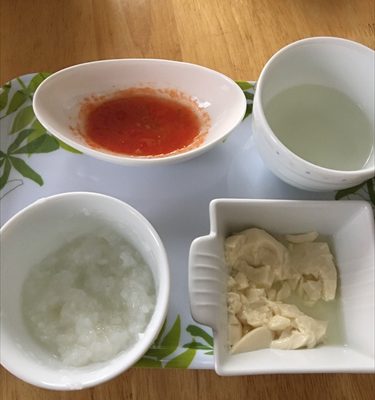 今日は姉が用意してくれた玉葱 大人のお裾分けで豆腐 ストックがけっこうある鯛 父が今朝炊いたご飯で作ったお粥…そんな組み合わせ