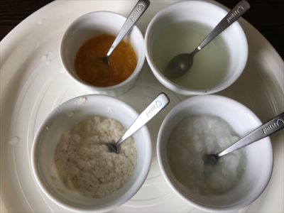 (キープの冷凍お粥キューブを「チン」→少しスープを追加して練りました)