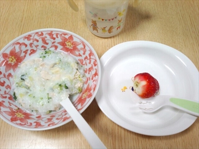 苺は写真では量をわかりやすいように丸ごとですが、喉に詰まる大きさなので、食べさせる際はもっと細かくしています~( ´∀`)