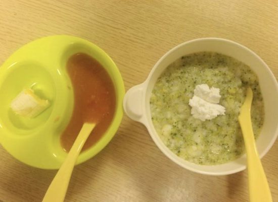 みじん切りしたブロッコリーを少量のお湯で湯がき、栄養たっぷりのその湯がき汁で細切れのおうどんも煮込みました。誤嚥が怖いので、うどんは、細めタイプに。
