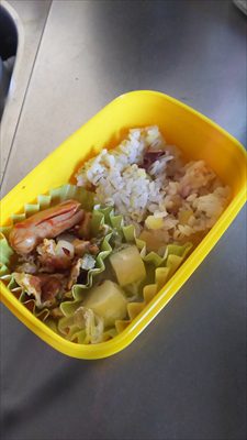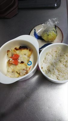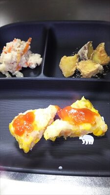 さつまいもはパクパクとあっという間に食べてしまい、おかわりコールが鳴りましたが、作ったものを全部分けてしまっておかわりがなかったので、代わりにふりかけご飯をおかわりで食べてもらいました。『次はもっと沢山作るね。』っと、ちびっこ怪獣ちびちび怪獣と約束をしました(^∇^)