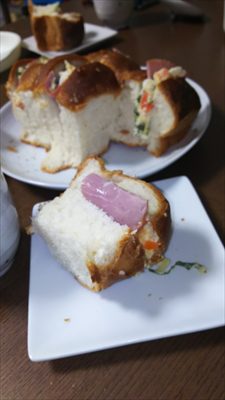 パンの切れ目に食べやすい大きさに切ったハムと玉子サラダを挟んで完成。
