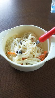 スパゲッティーよりも麺がやらかいので、フォークでクルクルしやすく、ちびっこ怪獣は自分で上手にクルクルしながら食べていました。ちびちび怪獣はクルクルして口に持っていくと、パクッチュルッと食べていました。