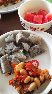 オムレツもミルクプリンもパクパク、ムシャムシャ食べていました。パンはホームベーカリーで作るときに練りごまを加えたのですが特に嫌がることもなく、ゴマパンをモグモグ食べていました。