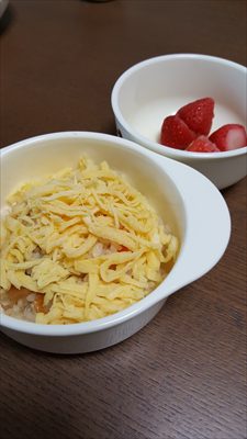 今日はちびっこ怪獣の入園式だったので、ちらし寿司を作ってお祝いしました。ちびちび怪獣も同じメニュー。ちびちび怪獣は初めての酢飯だったので、食べないかもしれないと思い、普通の白米も用意しましたが、気にする事無くモグモグ食べていました。