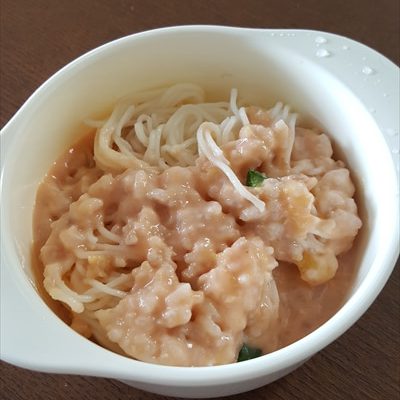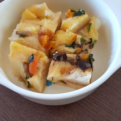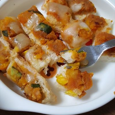 →一口大に切ったじゃがいも・かぼちゃをレンジでクルクルし、潰す。炒めた豚ひき肉・ホールコーン・角切りきゅうりと潰したかぼちゃ・じゃがいもを合わせてまぜまぜ。ケチャップで味付けしたら、パンの上に乗せて広げ、ピザチーズを乗せてオーブントースターでチーズが溶けるまで焼く。(焦げ目が付くまで焼くとパリパリと固くなってちびちび怪獣が食べにくくなってしまうので、チーズが溶け始めた所でトースターから出しました。)