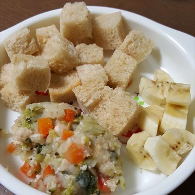 →人参・ブロッコリー・チンゲン菜・玉ねぎを食べやすい大きさに切って茹でて、じゃがいもフレークとまぜまぜ。様子を見ながら水を加える。