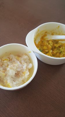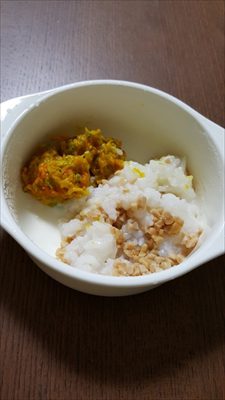 →冷凍ストックの野菜(かぼちゃ・人参・ブロッコリー)と手で砕いたお麩、水を一緒に耐熱容器に入れてレンジでクルクル。かぼちゃやお麩でトロッとするので、水が足りなさそうだったら、レンジでクルクルした後でお湯を加えて調節します。
