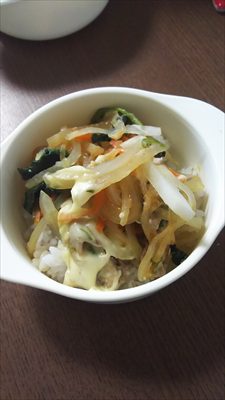 油を熱したフライパンでしめじ・ほうれん草を炒め、ウスターソース・塩・胡椒で味付けをしたら完成。
