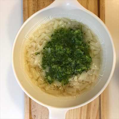 たまねぎは適当な大きさに切って、鍋で15分茹で、手動みじん切り器で細かくします。
