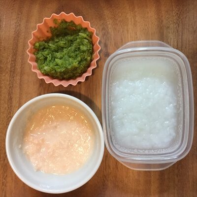 冷凍してストックしている茹でて細かく切ったにんじんと茹でてすりつぶしたささみを解凍します。