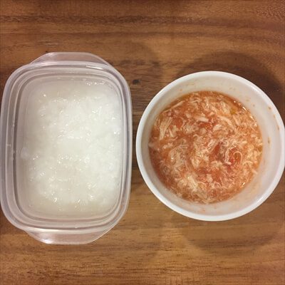 ごはん大さじ1に対して水大さじ6を鍋に入れて、20分焚き、15分蒸らし、すり鉢ですりつぶします。