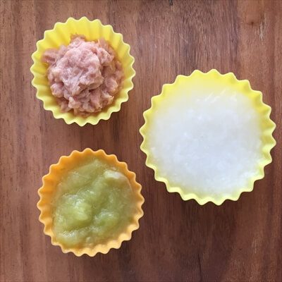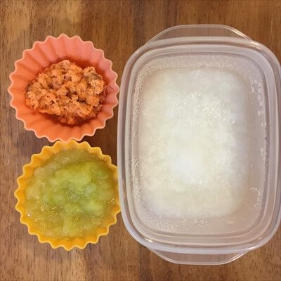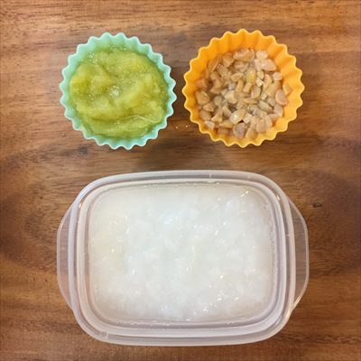 ごはん大さじ1に対して水大さじ6を鍋に入れて、20分焚き、15分蒸らし、すり鉢ですりつぶします。