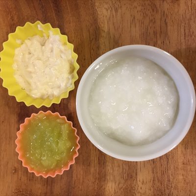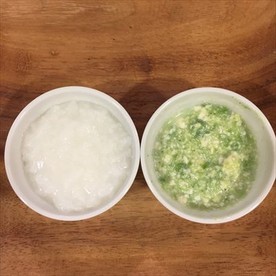 ごはん大さじ1に対して水大さじ6を鍋に入れて、20分焚き、15分蒸らし、すり鉢ですりつぶします。