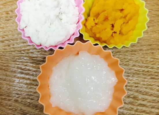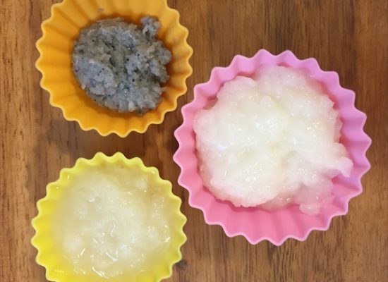 ごはん大さじ1に対して水大さじ6を鍋に入れて、20分焚き、15分蒸らし、すり鉢ですりつぶします。