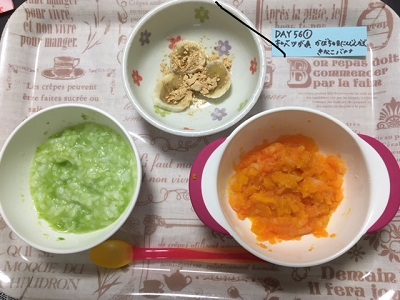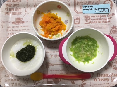 ゆめちゃん初ヨーグルトでした。すっぱかったのか、初めはオエッという顔をしました。でもお口開けて要求してきたので食べさせるとまた変な顔をされてしまいました。おいしいのか?まずいのか?ちょっとよくわからない反応でした。にんじんポテトはペーストではなく粒のため、モグモグしてから飲み込んでいましたが、キャベツは比較的飲み込みがちでした。